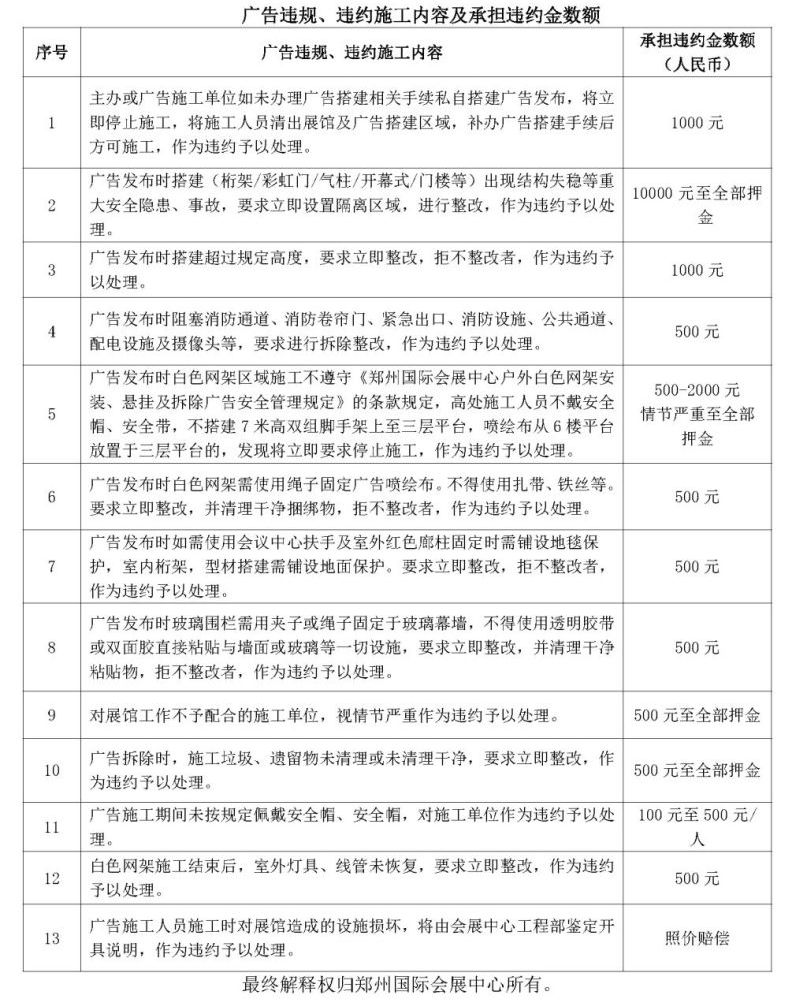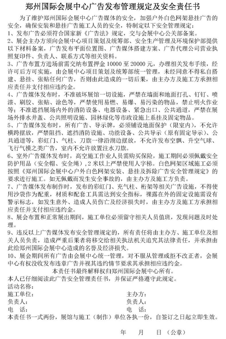 首頁服務(wù)指南主辦指南文章詳情 文章詳情 廣告發(fā)布管理規(guī)定及安全責(zé)任書 廣告發(fā)布管理規(guī)定及安全責(zé)任書 ·《鄭州國際會(huì)展中心廣告發(fā)布管理規(guī)定及安全責(zé)任書》文檔下載