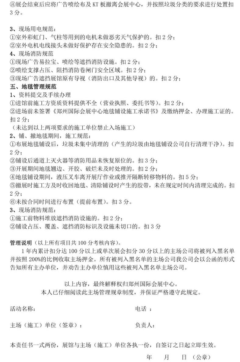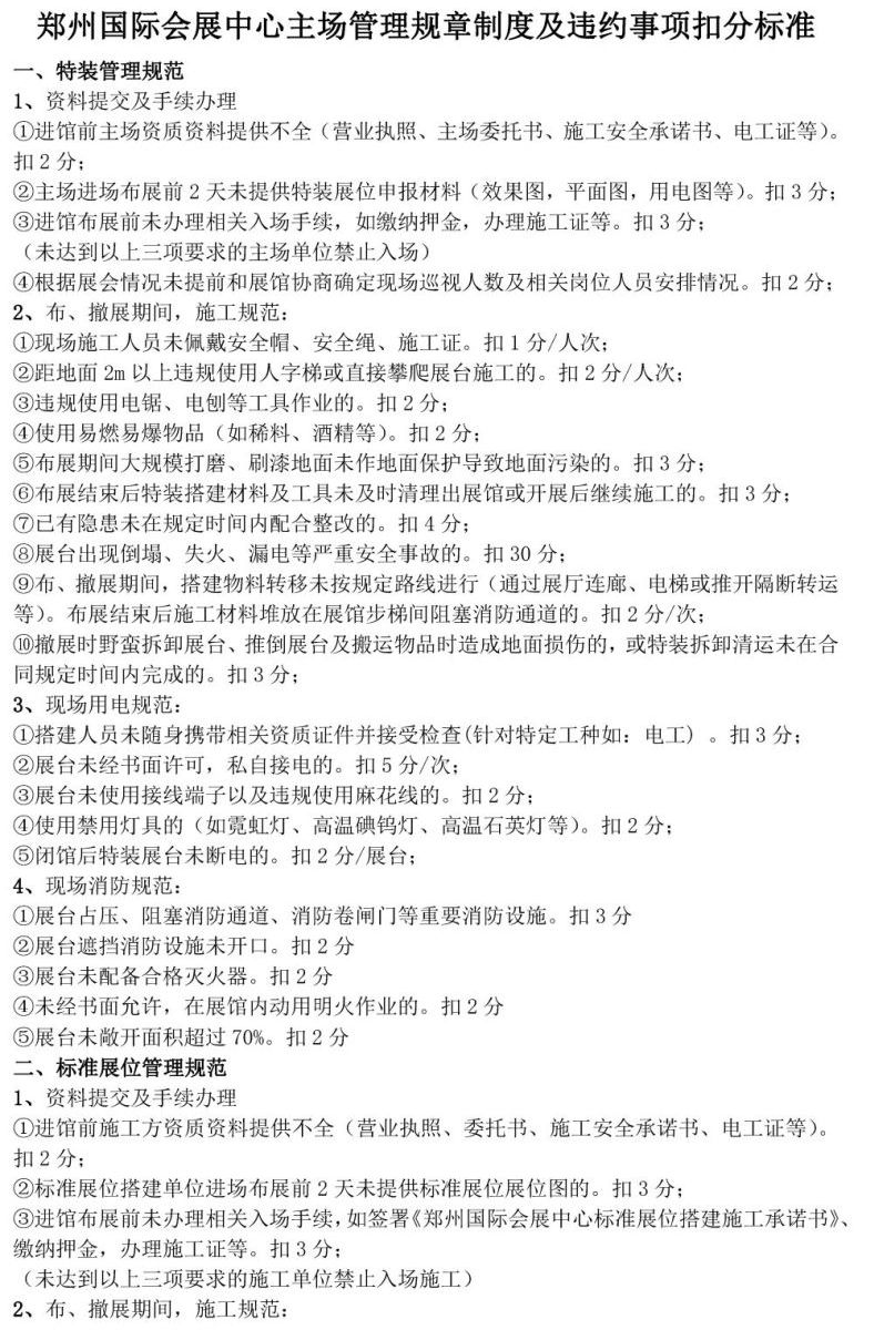 首頁服務(wù)指南下載中心文章詳情 文章詳情 主場管理規(guī)章制度及違約事項扣分標準 鄭州國際會展中心主場管理規(guī)章制度及違約事項扣分標準 《鄭州國際會展中心主場管理規(guī)章制度及違約事項扣分標準》文檔下載