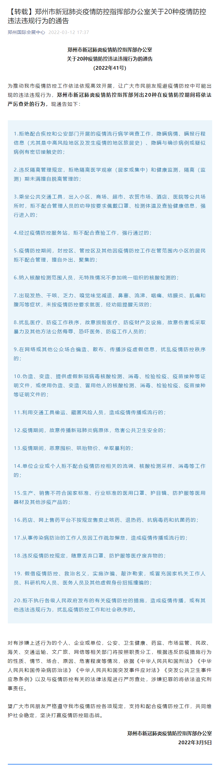 【轉載】鄭州市新冠肺炎疫情防控指揮部辦公室關于20種疫情防控違法違規行為的通告
